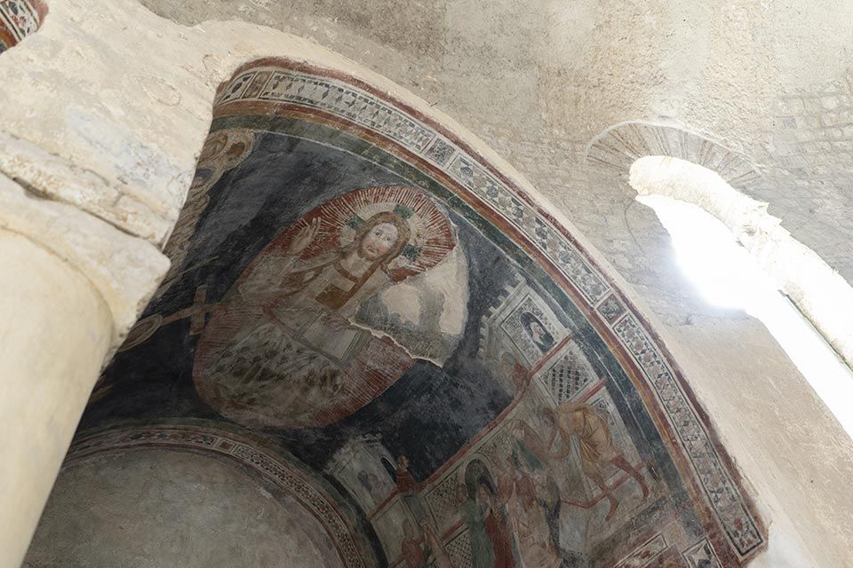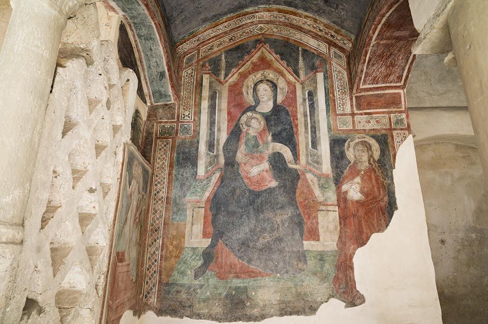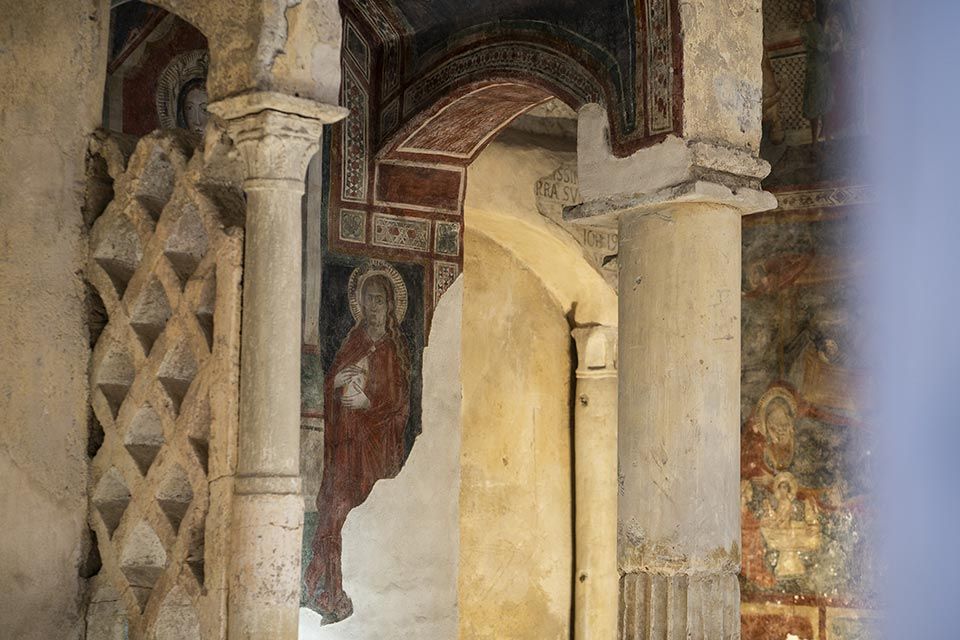 Nel corso dei secoli sulla muratura perimetrale del battistero vennero costruite diverse cappelle. Nel XIV secolo fu costruita la cappellina alla sinistra dell’ingresso, che conserva affreschi di particolare pregio. Il ciclo pittorico è forse opera di Roberto d’Oderisio, artista attivo nel Salernitano nella seconda metà del XIV sec, fortemente ispirato dai lavori napoletani di Giotto. Nella parte destra sono raffigurati quattro episodi significativi della vita di Cristo: la natività (secondo l’iconografia bizantina), la strage degli innocenti, la salita al calvario e la discesa agli inferi. Sulla volta a botte invece un cristo pantocratore, inserito in una mandorla. Nella parte sinistra è ritratta una Madonna in trono con in braccio il piccolo Gesù, che regge un rotolo su cui è riprodotto il versetto evangelico “Ego sum via”, io sono la via. Di fianco, l’episodio del sepolcro vuoto secondo la versione di Matteo: l’angelo, seduto sulla tomba, annuncia alle due donne la risurrezione del Cristo.