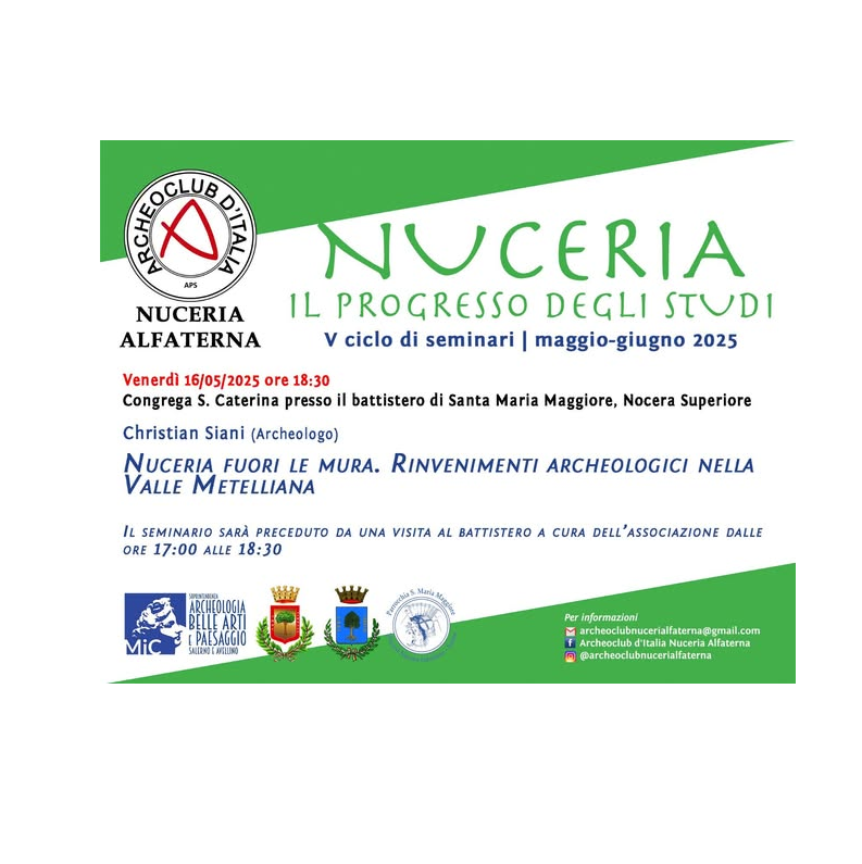 Il 16 maggio presso la Congrega di Santa Caterina si è svolto un interessante seminario di studi promosso dal Archeoclub d'Italia Nuceria Alfaterna. Il convegno è stato preceduto da una visita guidata al Battistero a cura dei soci del Archeoclub.